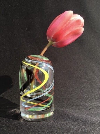 *赤、青、緑、黄、黒という、5色の色ガラスを使った一輪挿しです。