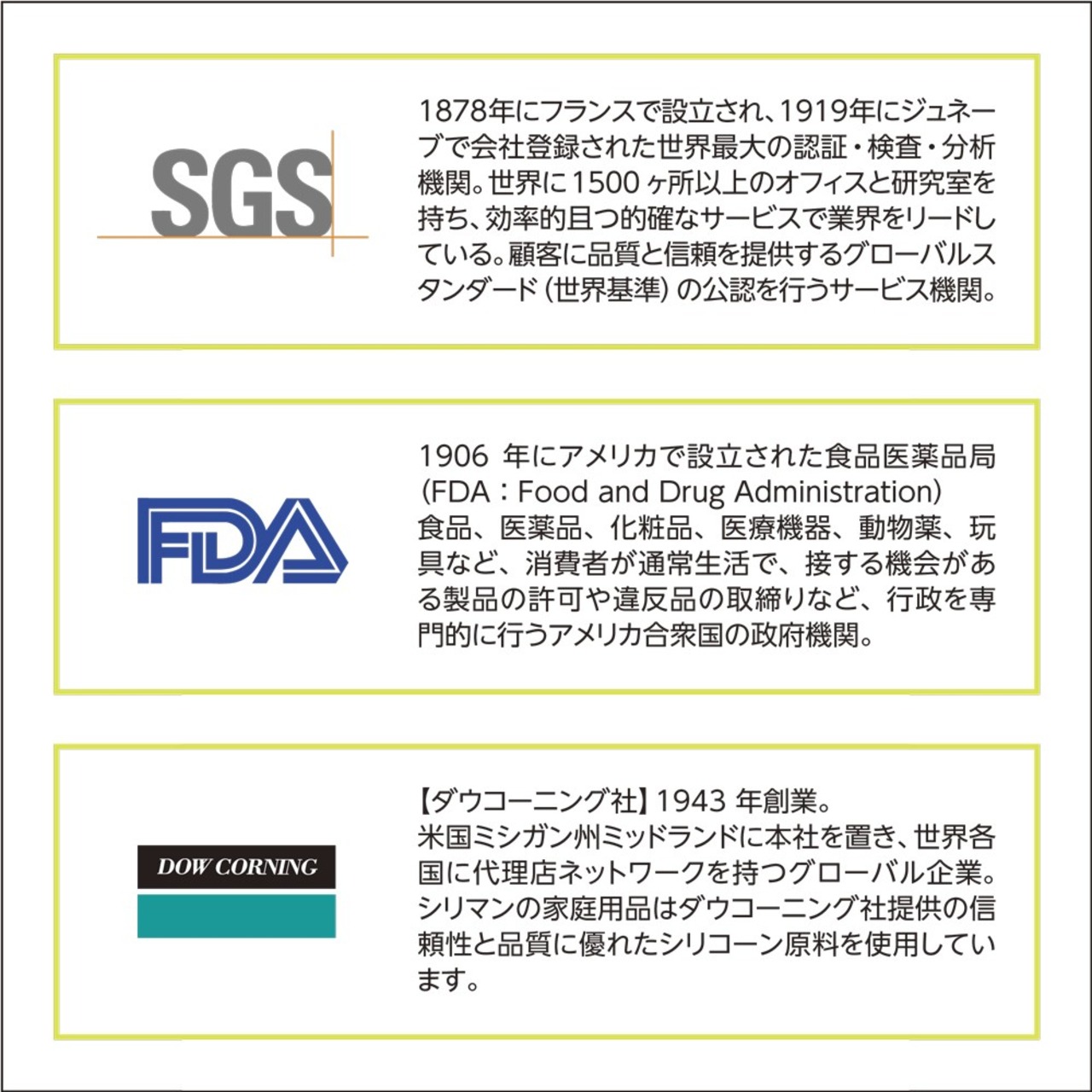 天然の砂(ケイ素)を原料に、プラチナ(白金)を触媒として利用する製造工法で作られるため、ゴム特有の臭みのない製品になっています。このシリマン社のシリコン製品は世界的基準であるFDA・SGSの認証を得て、日本の厚生労働省が定める食品衛生基準にも適合しているので安心してお使い頂けます♪