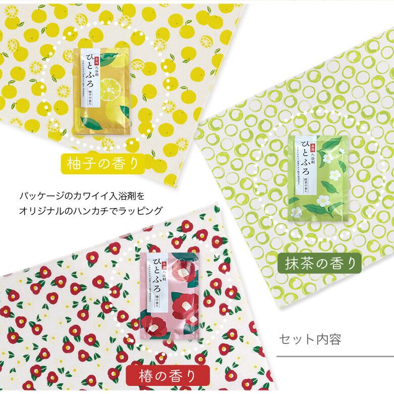 ハンカチは手ぬぐい生地で中身の入浴剤 ゆずの香り、椿の香り、抹茶の香りに合わせてプリントしました。バレンタインデーやホワイトデー、クリスマスなどの季節イベントやちょっとしたプレゼント、お返し、結婚式のお礼など ”ありがとう”の気持ちを伝えるシーンにピッタリなプチギフトです。
