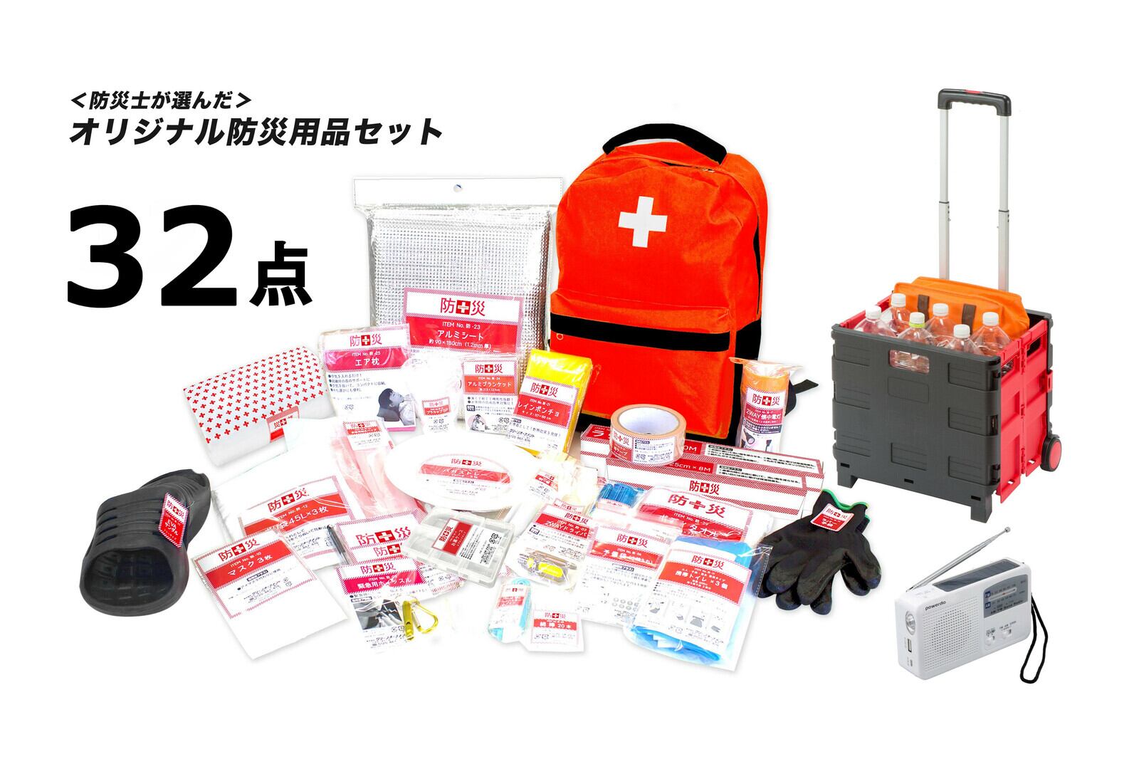 【32点セット】リュックサック、緊急用ホイッスル、2WAYドライバー、カッター、圧縮袋、予備袋、筆記用具セット、歯ブラシ×3本、綿棒×20本、マスク×3枚、携帯トイレ×3個、45Lポリ袋×3枚、紙皿×3枚、プラカップ×5個、割り箸×5膳、スプーン・フォークセット、2WAY懐中電灯、ラバー手袋、お薬ケース、布テープ、レインポンチョ、サンダル、アルミシート、アルミブランケット、エア枕、非常用給水バッグ、ラップ、アルミホイル、ボディタオル、ティッシュ、折りたたみフタ付きキャリー、防災ラジオ
