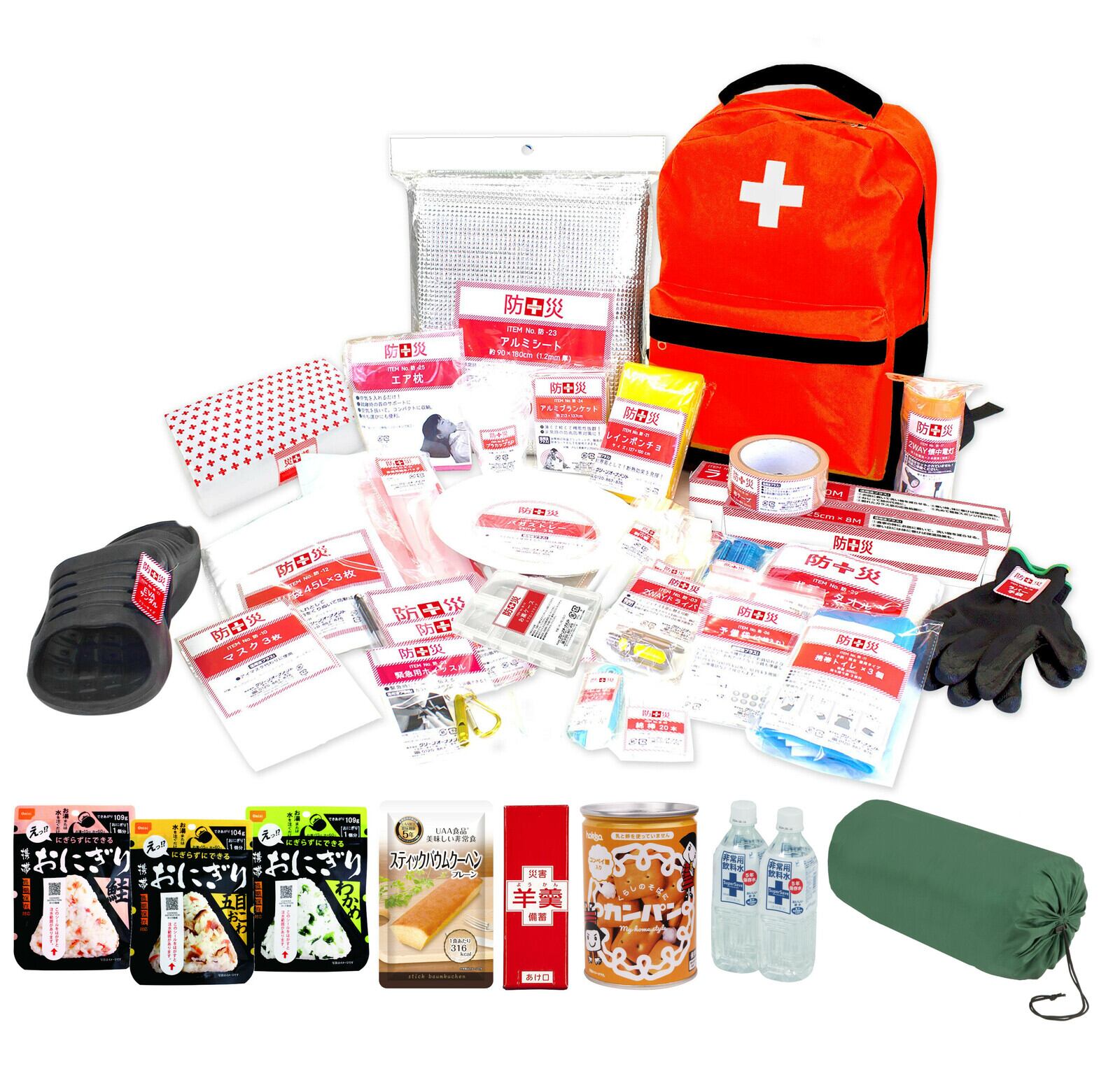 【39点セット】リュックサック、緊急用ホイッスル、2WAYドライバー、カッター、圧縮袋、予備袋、筆記用具セット、歯ブラシ×3本、綿棒×20本、マスク×3枚、携帯トイレ×3個、45Lポリ袋×3枚、紙皿×3枚、プラカップ×5個、割り箸×5膳、スプーン・フォークセット、2WAY懐中電灯、ラバー手袋、お薬ケース、布テープ、レインポンチョ、サンダル、アルミシート、アルミブランケット、エア枕、非常用給水バッグ、ラップ、アルミホイル、ボディタオル、ティッシュ、洗えるあったか2WAY寝袋、おにぎり/各42g(鮭・わかめごはん・五目)×各1袋、バームクーヘン/80g、羊羹/50g×1個、カンパン/110g×1缶、保存水/500ml×2本