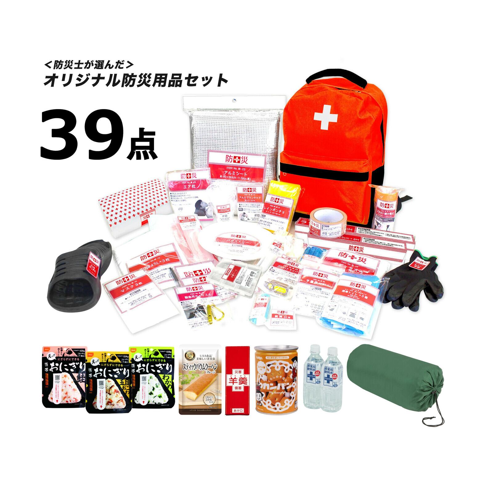 【39点セット】リュックサック、緊急用ホイッスル、2WAYドライバー、カッター、圧縮袋、予備袋、筆記用具セット、歯ブラシ×3本、綿棒×20本、マスク×3枚、携帯トイレ×3個、45Lポリ袋×3枚、紙皿×3枚、プラカップ×5個、割り箸×5膳、スプーン・フォークセット、2WAY懐中電灯、ラバー手袋、お薬ケース、布テープ、レインポンチョ、サンダル、アルミシート、アルミブランケット、エア枕、非常用給水バッグ、ラップ、アルミホイル、ボディタオル、ティッシュ、洗えるあったか2WAY寝袋、おにぎり/各42g(鮭・わかめごはん・五目)×各1袋、バームクーヘン/80g、羊羹/50g×1個、カンパン/110g×1缶、保存水/500ml×2本