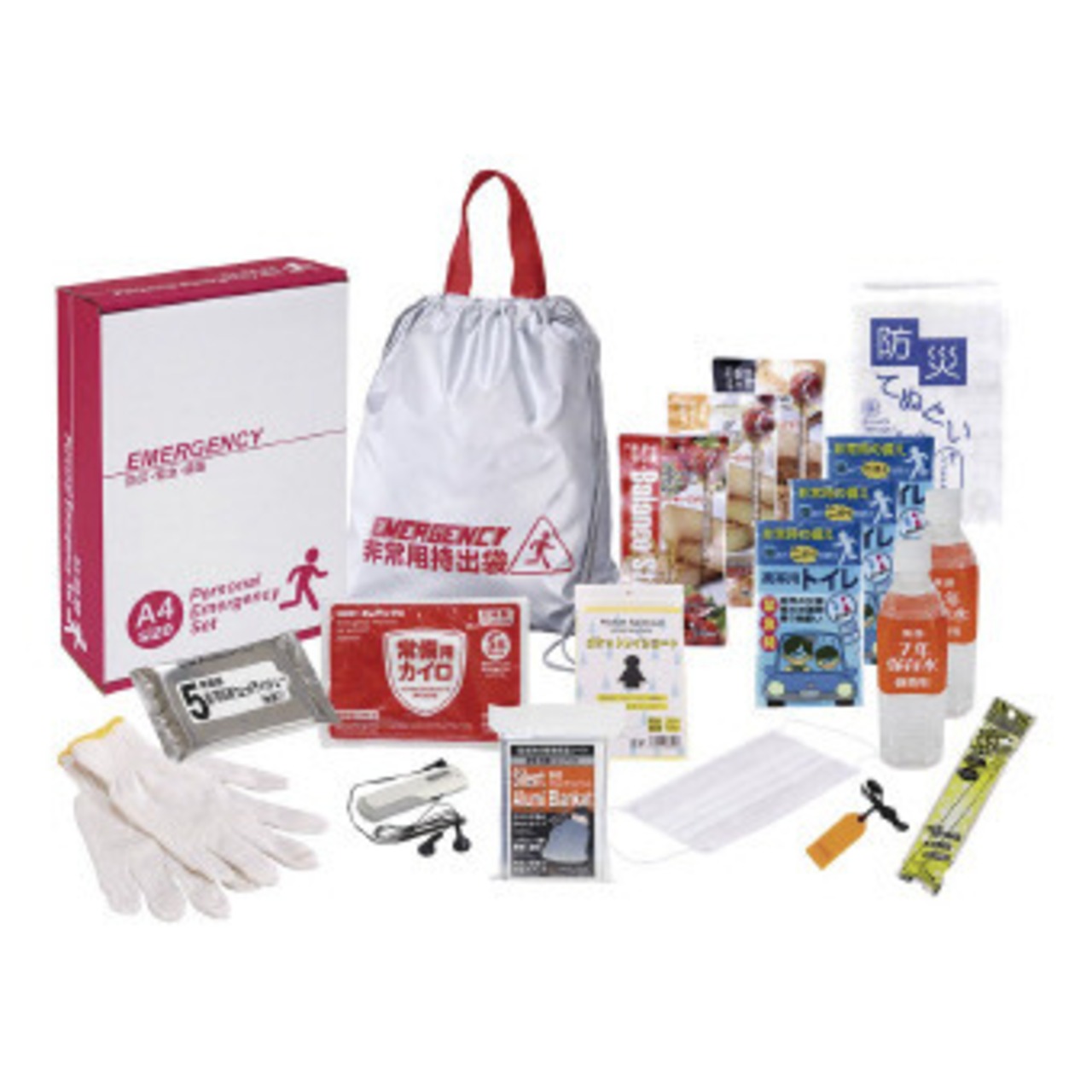 職場や避難先での滞在や帰宅を支援。棚や机の引き出しなどでも効率よく収納できるA4ファイルサイズです。水とバランススティックはともに7年保存できます。